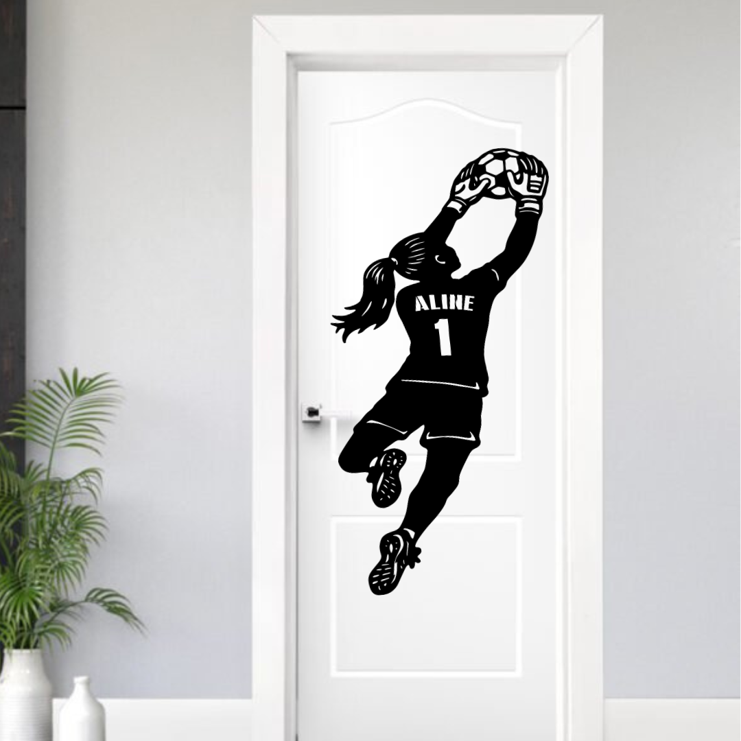 Nossa Silhueta de Jogadora Goleira Personalizada é perfeita para decorar portas ou paredes, deixando o ambiente moderno, esportivo e cheio de personalidade.